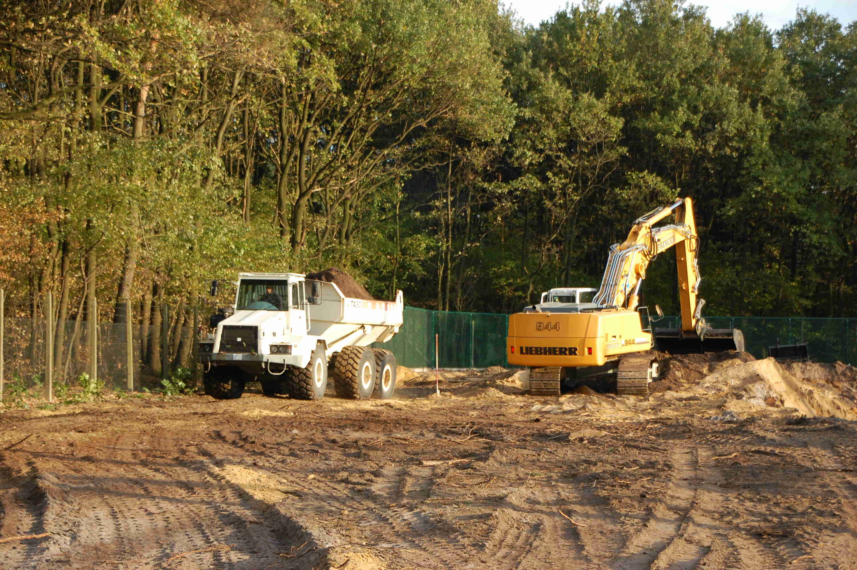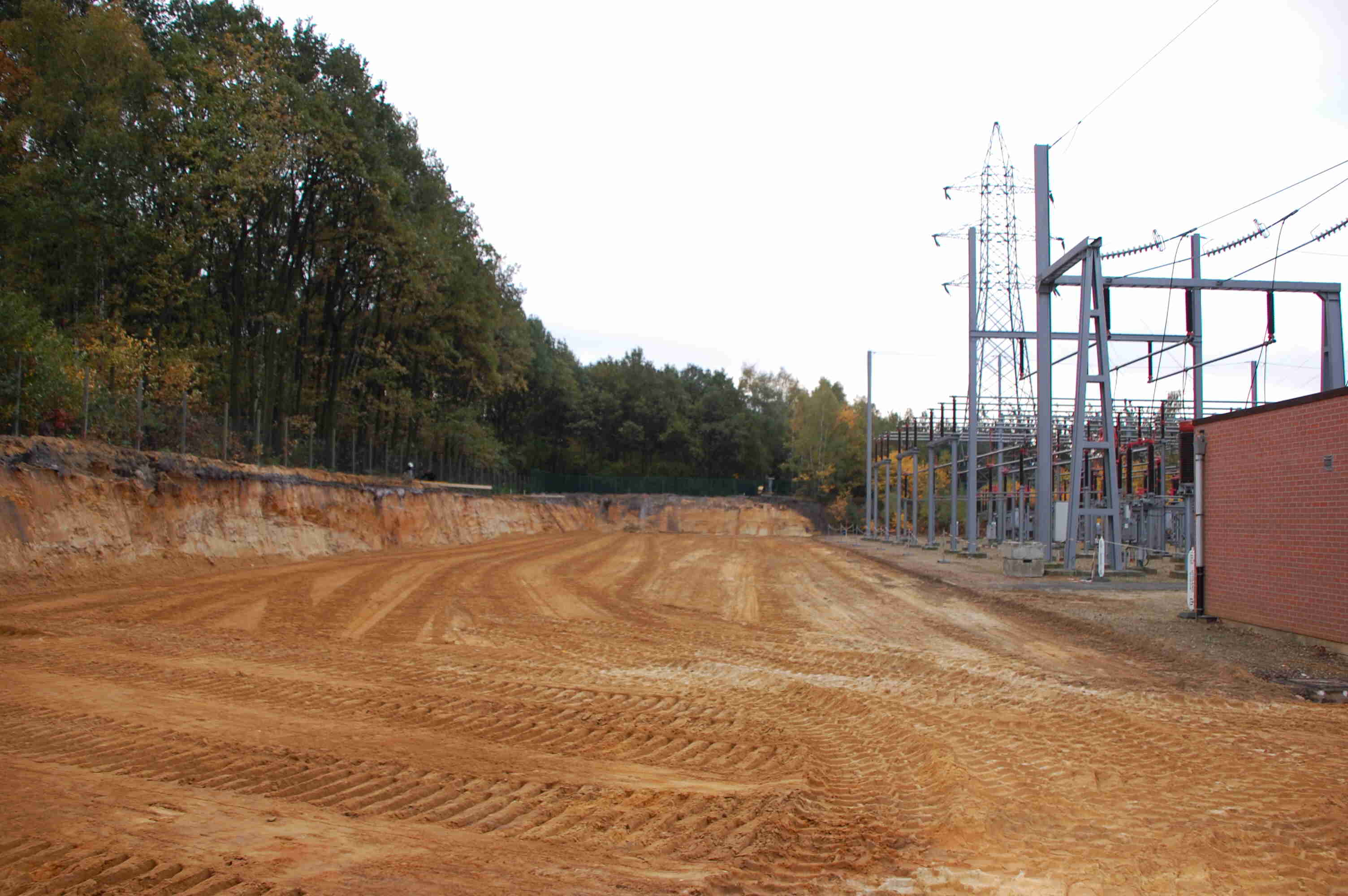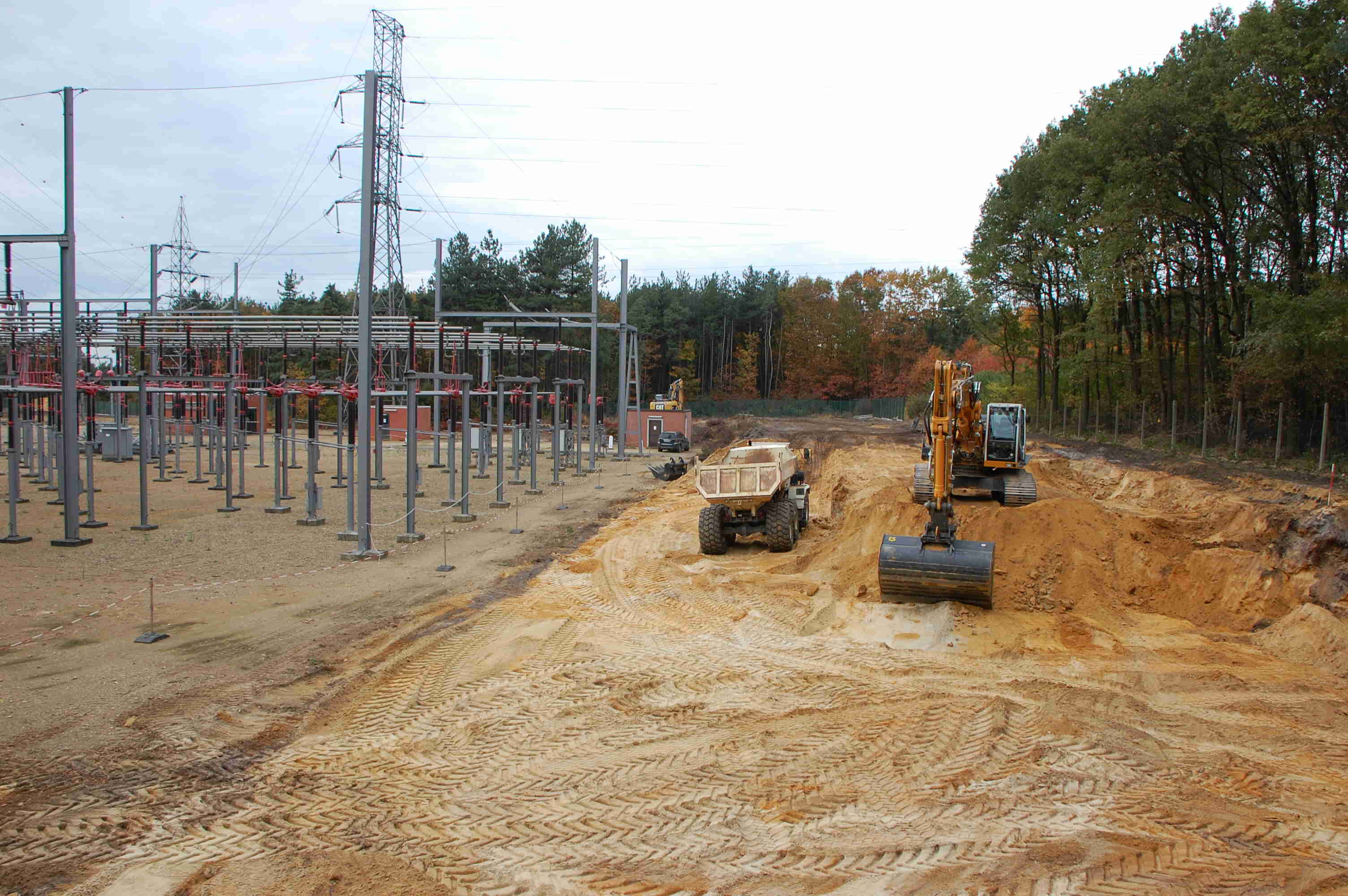 Groot grondverzet Om beide nieuwe velden ( extra en condensatoren) te realiseren diende er een massa grond verzet te worden. In totaal moest er zo'n 6300 kubieke meter zand verzet worden. Bovendien vond dit groot grondverzet plaats in een in dienst staande post van 150 000 volt. Om dit werk tot een goed einde te brengen hebben wij onze liebherr 944C 43 tons graafmachine ingezet voorzien van een graafbak van 3,6 kubieke meter. Om de grond af te voeren kwamen er een TEREX 30 tons knikdumper en een fendt 936 tractor met gronddumper aan te pas.