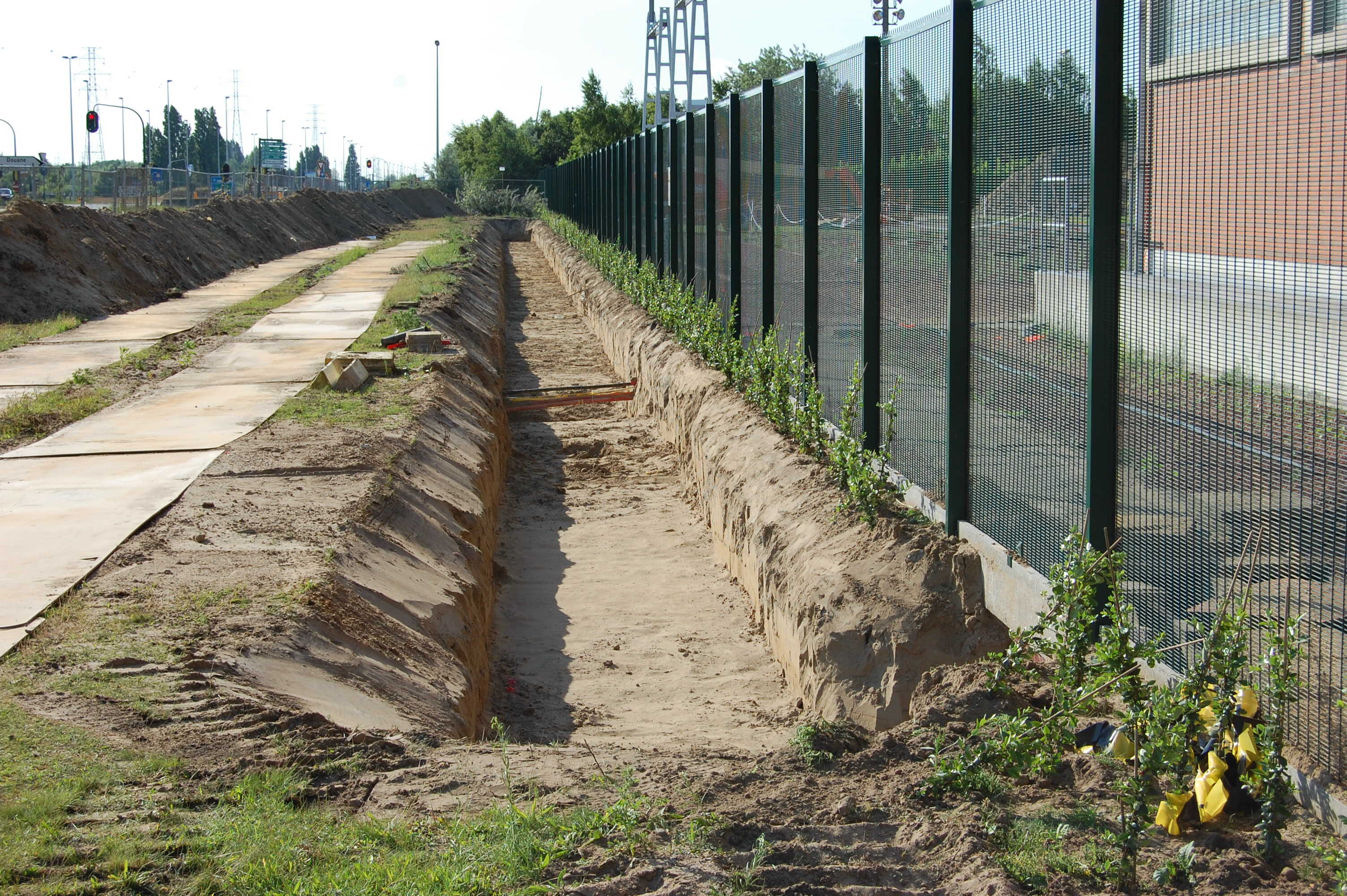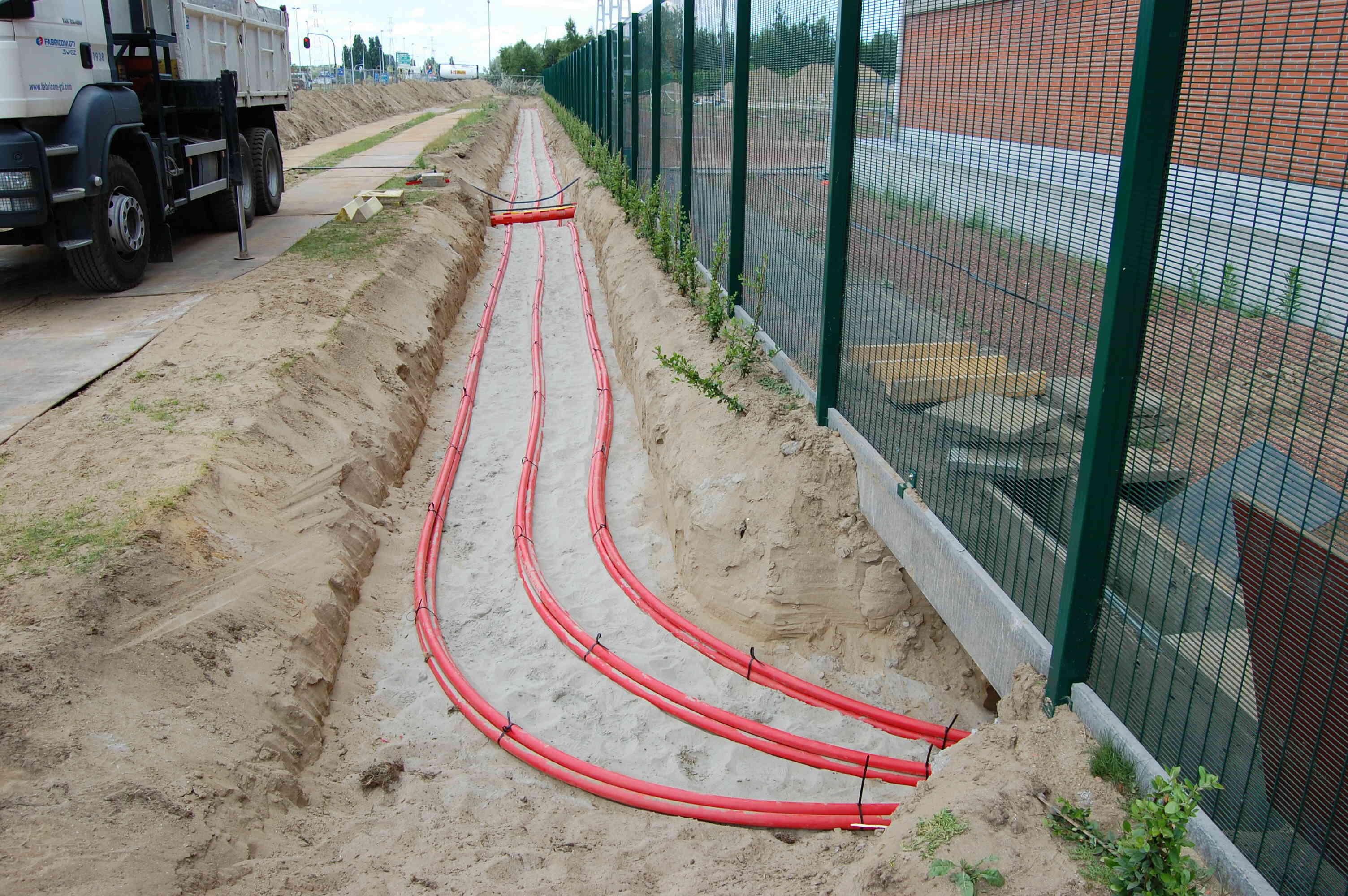 Uitvoering De verbinding zal bestaan uit 3 feeders van 36000 volt geplaatst in een zuiver zandbed. Elke feeder bestaat uit 3 PRC kabels geleverd door Nexans met een sectie van 400 mm² Alu. De verbinding beslaat ongeveer een 120 meter en er dient 7 maal een andere 36 kV verbinding gekruist te worden. De sleuf werd met onze speciale compacte 9 tons Caterpillar 307C SB VA uitgegraven. De aanvul- en nivelleringswerken na het plaatsen van de feeders gebeurde met onze Caterpillar 277B rupslader |